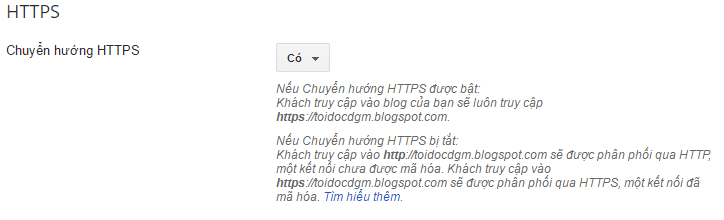 Đối với tên miền mặc định thì lại đơn giản hơn rất nhiều. Các bạn chỉ cần bật https cho blog của mình lên là được nhé!